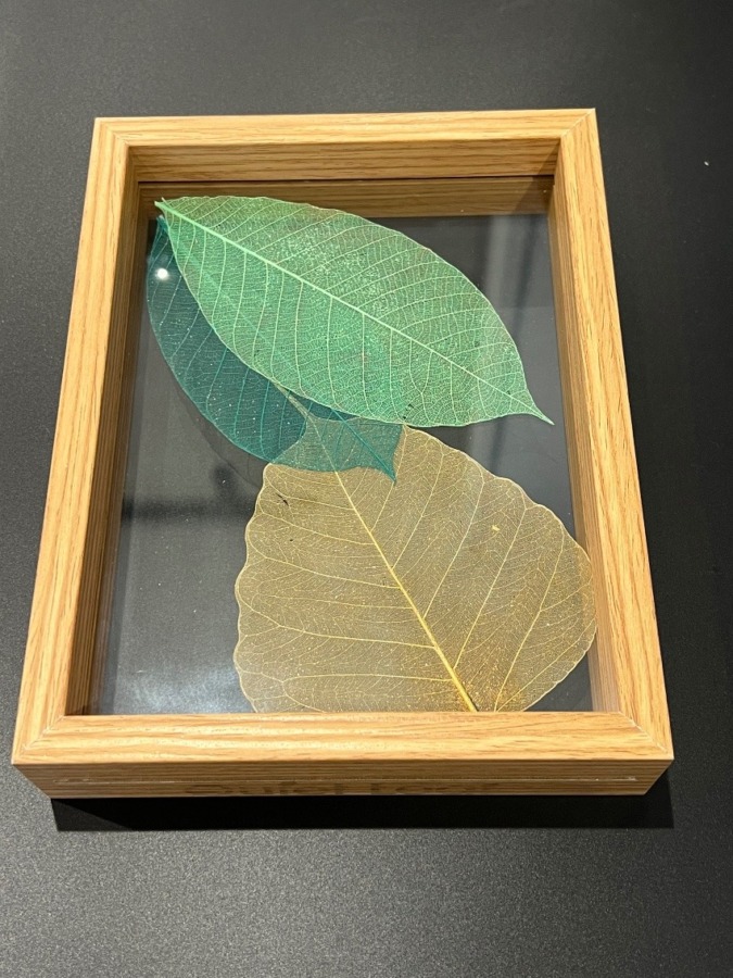 カラフルで色々な形のスケルトンリーフを組み合わせて、ガラスのフレームに挟むだけの置き型のアート作品になります。